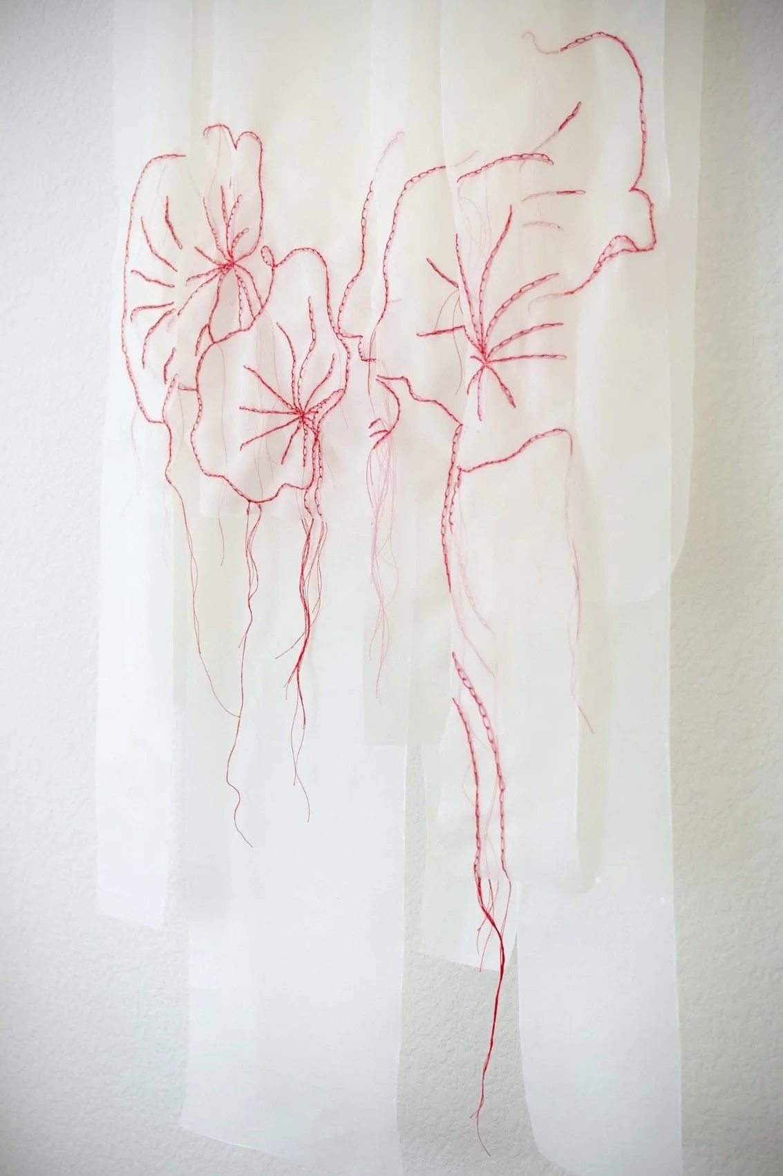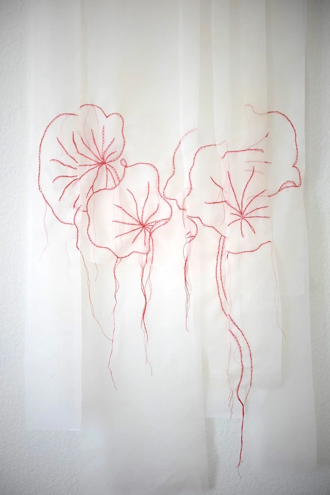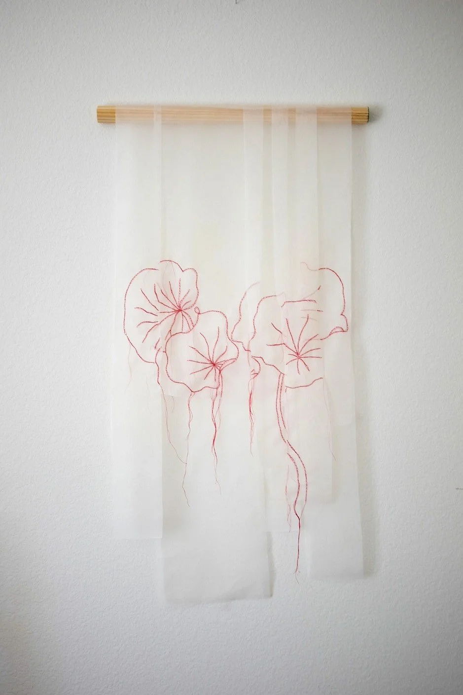 A continuation of a theme of the lotus as a symbol of resilience. This piece features lotus leaves embroidered onto delicate slices of organza. The leaves appear in limbo between fractured and whole. In the same way, cultures are chipped away through each generation, yet doing so gives room for new developments as modern day becomes history and history finds itself into modern day.