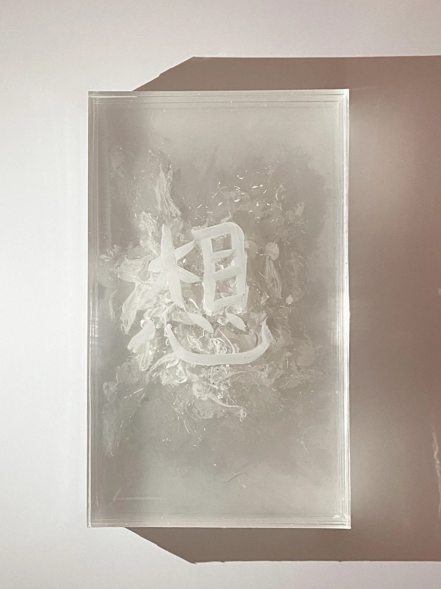 Xiăng (想) has always been a fascinating character to me, as it holds several meanings depending on its context; it can mean to miss, to want, to think about, or to wish, yet all of these alternate meanings bear a sense of yearning and longing. To capture the essence of the character and all of its meanings, I created six sheets of resin, each with an iteration of the character in progressively illegible forms. The sheets are initially presented stacked upright, giving the viewer initiative to remove each layer one by one to reveal how the character's form gets more and more lost to the resin.